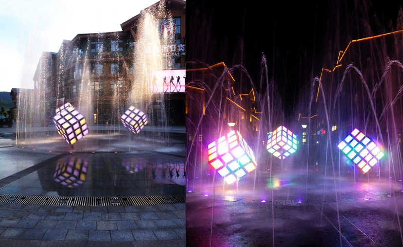 魔方燈采用聲光電和智能控制相結合,并配以高效的LED光源。夜幕降臨,3組魔方燈通過預設的光效變換模式,開始了絢麗的燈光秀,時而忽快,時而忽慢;時而交相輝映,時而如夢如幻,伴隨著音樂,與噴泉共同演繹一幕幕動感的燈光舞劇,為游客呈現一場美輪美奐的視覺盛宴。