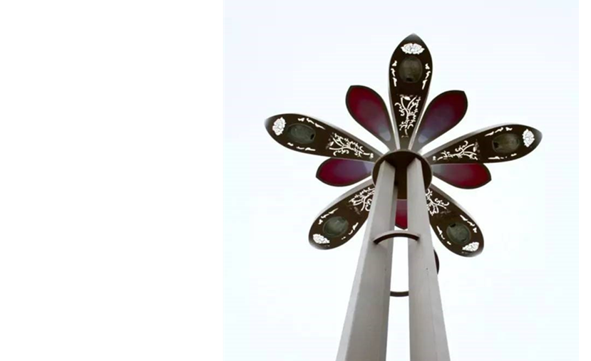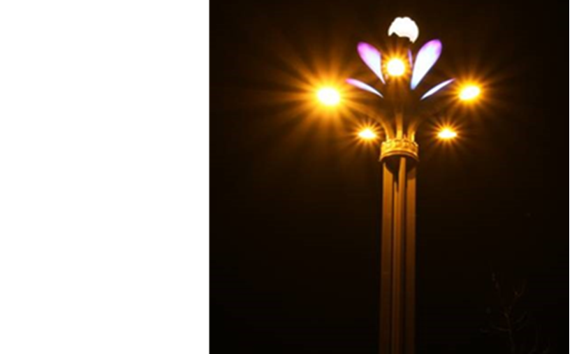 燈桿頂部裝飾座提取蓮花寶座特征進行開模制作,增加燈桿美觀性。葉片夜景效果荷葉形完美展現出來,使整個燈型的功能照明和景觀照明完美結合。