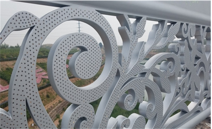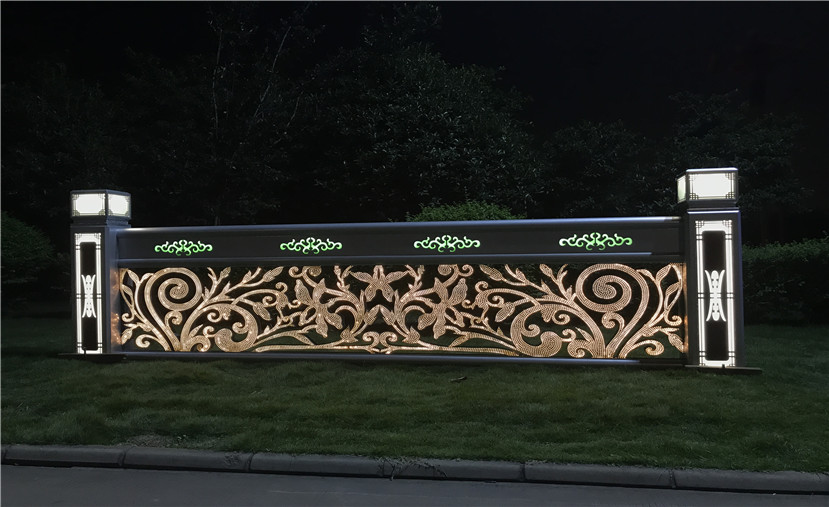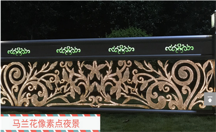 護(hù)欄體用不銹鋼材料雕刻、點(diǎn)焊成型。造型是鄂爾多斯市花馬蘭花。作品前后兩面激光切割三千個(gè)以上的小孔,作為出光像素點(diǎn),內(nèi)貼高目數(shù)不銹鋼防蟲網(wǎng),腔體內(nèi)根據(jù)造型曲線內(nèi)埋LED軟燈帶,并用專業(yè)卡扣固定。護(hù)欄上部橫向鏤空四朵馬蘭花紋飾,并用帶色透明樹脂填充。