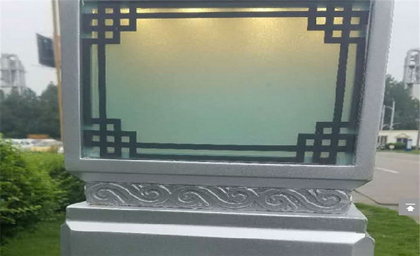 柱體前后兩面、柱頭四面用厚度足夠的磨砂玻璃實(shí)現(xiàn)內(nèi)透,玻璃外以陽雕形式粘貼金屬雕刻件,腔內(nèi)隱藏光源實(shí)現(xiàn)內(nèi)透。