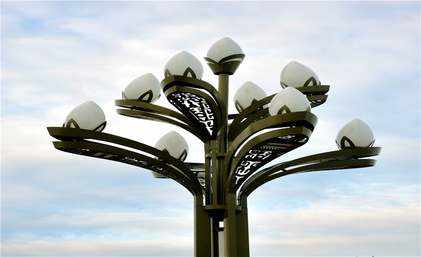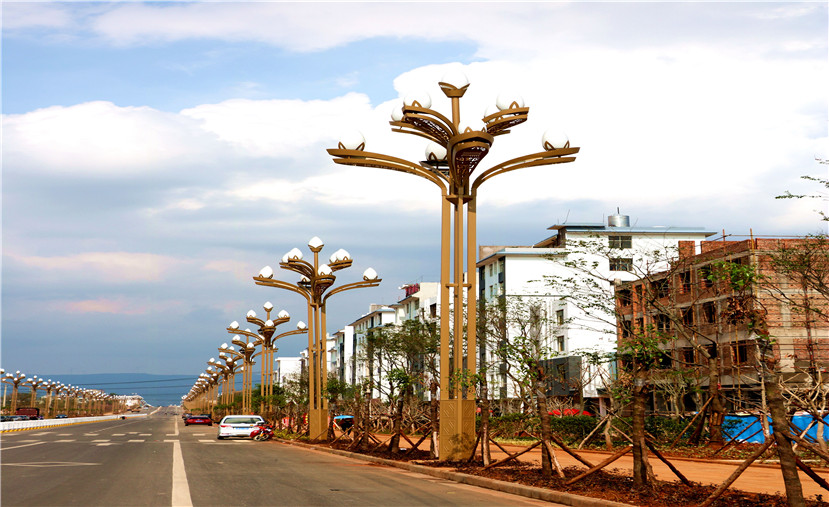 八叉九火玉蘭燈,燈高16米,燈桿呈古銅色,外觀造型大氣而有質感,桿體內側安裝LED節日氛圍燈條;光源采用全LED光源,替代傳統鈉和節能燈光源,道路照度均勻度和環境進一步提升。