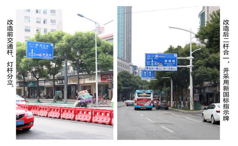 華體照明為其定做的“展望”多功能共享桿,將各種桿體集中到路燈一根燈桿上,天網攝像頭、路邊交通指示牌全部遷移至共享桿桿體上,獨立的小桿全部被拔除,攝像頭背包箱中的設備也轉移到共享桿的燈座內,桿體從此不再“背包袱”。