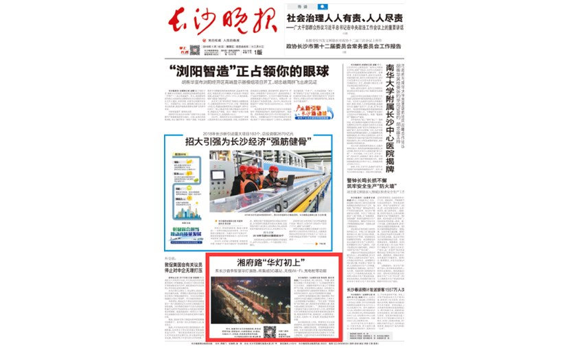“芙蓉朝暉”智慧路燈建成亮燈后,得到了湖南當(dāng)?shù)毓俜矫襟w的重點(diǎn)關(guān)注和報道。1月18日,長沙晚報在頭版重點(diǎn)報道湘府路上這條長沙市首條智慧路燈示范段。