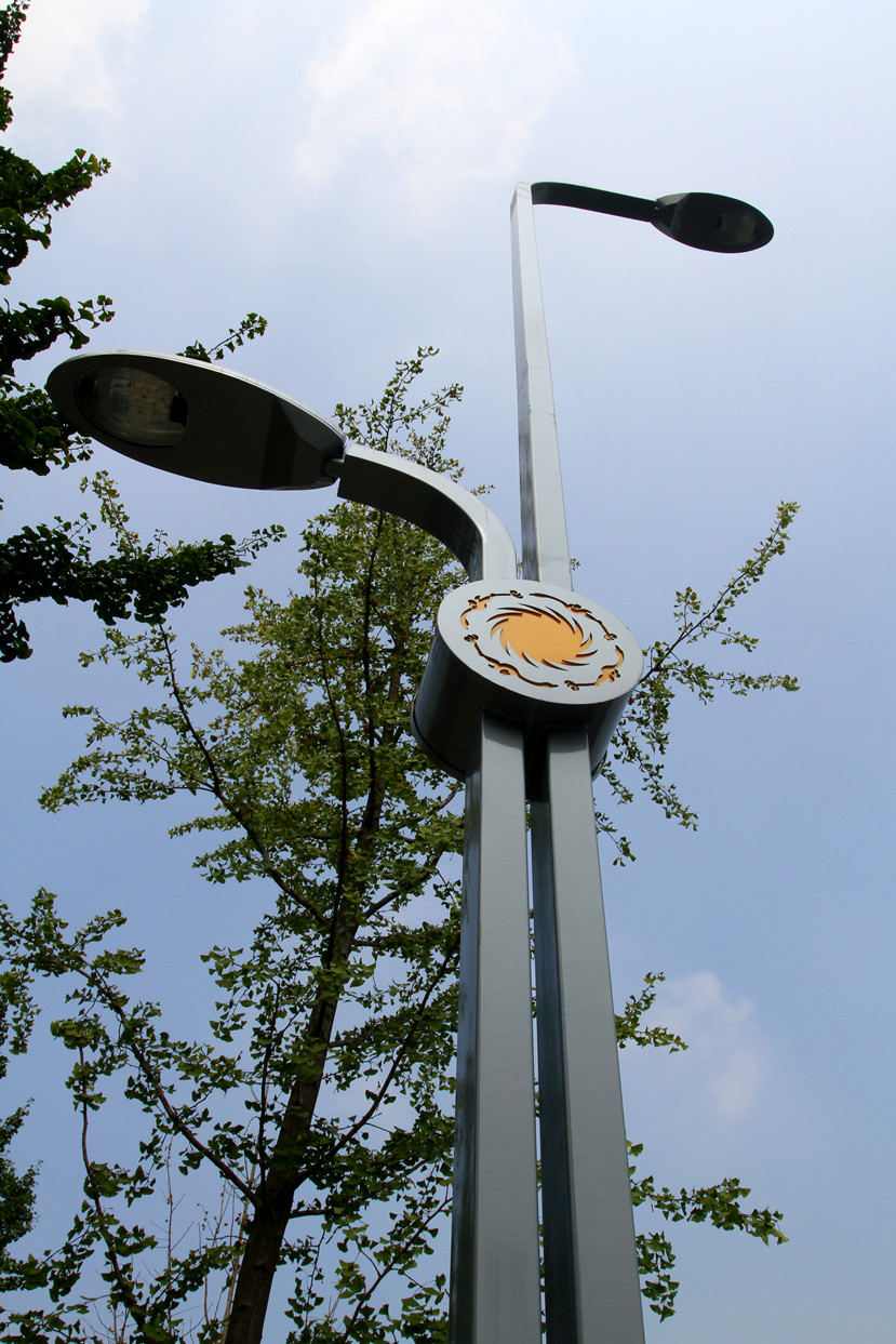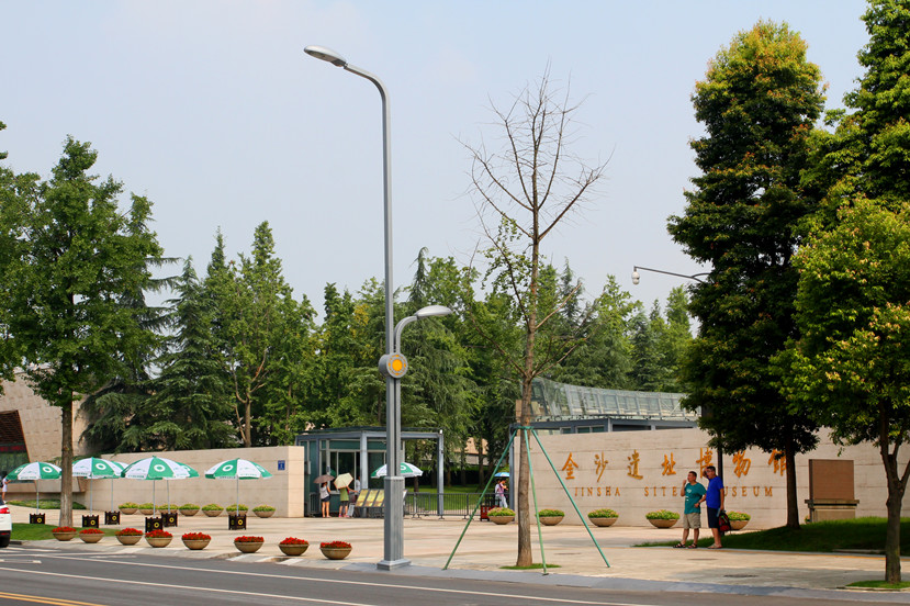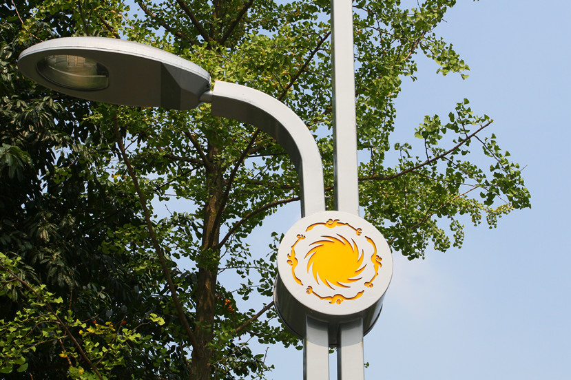 神暉,富有現代感,頗具特色。燈桿,使用具有文化色彩和現代感的顏色——灰色,在燈桿中段建立連接,加上成都獨有的內透太陽神鳥鏤空圖案,蘊含了濃郁的地域文化。