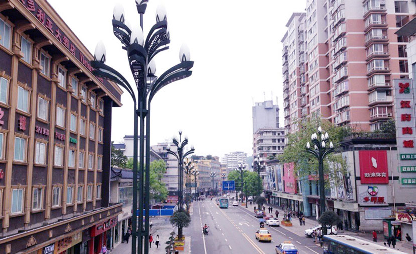 宜賓為了打造長江上游國際生態山水園林城市,加快翠屏區中心城區舊城改造步伐,2014年1月將宜賓城區人民路、中山街、專署街路燈設施進行升級改造。四川華體照明科技股份有限公司為此改造項目提供了照明方案設計、產品研發制造等服務。本次照明改造項目采用的燈型為八叉九火玉蘭燈和四叉五火玉蘭燈,數量共計70套。燈型設計方面,在保留玉蘭燈燈型美,對宜賓經典文化元素進行挖掘,加之符號化,并運用到燈型設計中,在滿足功能照明的前提下,提升道路景觀性。
