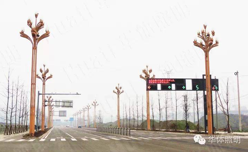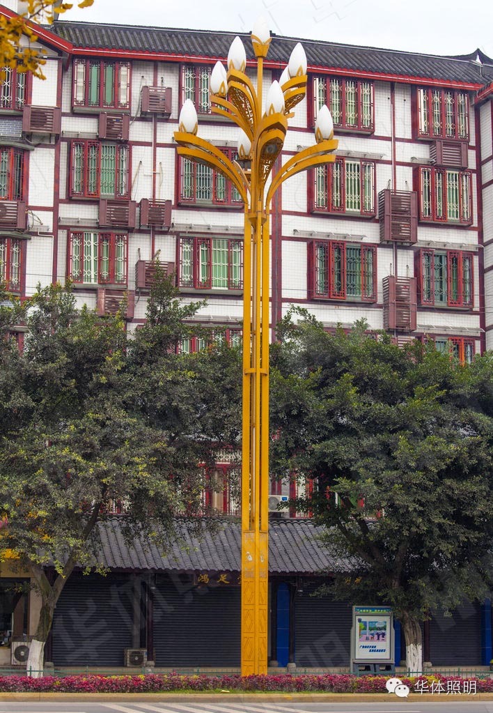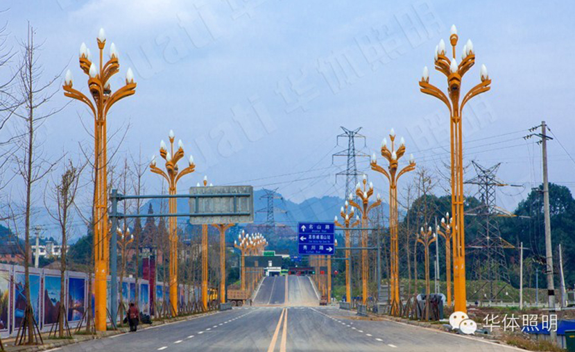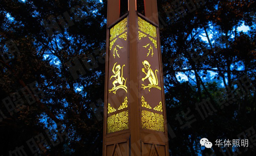 玉蘭燈,系華體照明精心打造的景觀照明路燈,兼顧景觀性與功能性,矩桿中間加載有可變色節日氛圍燈,營造出熱鬧的節日氛圍,節日氛圍燈的下方,鏤空的靈猴嬉戲圖活潑生動憨態可掬,在色彩變幻的LED貼片燈的照射下更加清晰靈動,帶給剛踏進峨眉之地的游客驚喜。