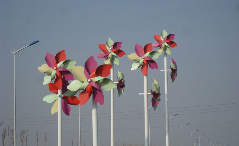 設計理念以風車造型為創作元素,經過設計者的提煉,設計為圓形風車和四葉風車兩種。葉片根據風力學進行設計,可隨風轉動,具有生命力。本項目中共運用了五柱景觀風車,安裝在達坂城洛賓路。