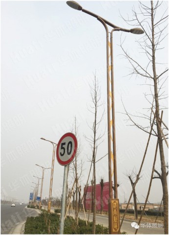 新區(qū)內(nèi)工業(yè)大道及幸福大道運用的景觀路燈,曲線簡潔大方。燈頭采用華體專利“和諧”,工業(yè)感強,棕色桿體內(nèi)鏤空的金黃色紋理活潑生動,底座加載文化元素—漢儀篆書繁體“渭南新區(qū)美麗經(jīng)開”與“魅力新城 田園都市”字體垂直均勻分布于燈桿底座上。