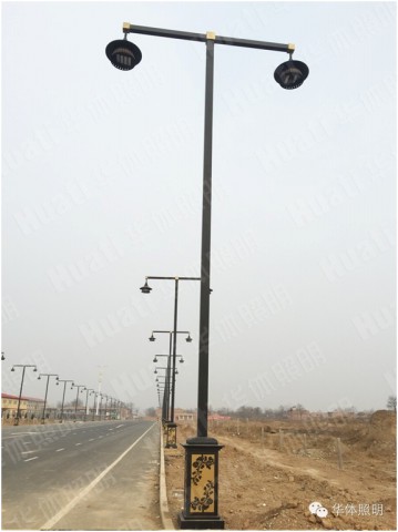 建設路,黑色桿體的景觀燈宏偉整齊的屹立在車道兩旁,矗立延伸,華麗而莊重。采用特殊工藝的自制燈頭,垂直于燈臂兩側(cè),立體感強。單桿連接的底座,黑色金屬板鏤空雕花,代表渭南市花月季栩栩如生,傳遞地域文化。