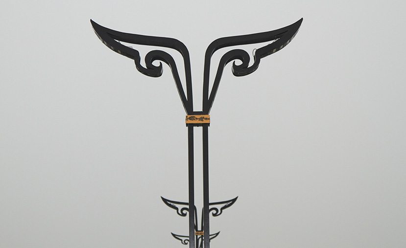 燈頭部分,以“鳥羽”為元素,設(shè)計(jì)形成燈背,并在燈背上表現(xiàn)古蜀文化符號,以鏤空的方式處理,讓燈背顯得厚重卻又不沉悶;在燈頭與燈桿、燈桿與底座之間分別設(shè)計(jì)處圓形的金色圍箍,用以加載魚鳧時(shí)期典型的“魚紋”圖案;底座上,加載玉璋,使文化內(nèi)容表現(xiàn)更加濃郁、豐富;燈桿部分,采用大膽創(chuàng)新的中空矩形燈桿,形成通透之感。